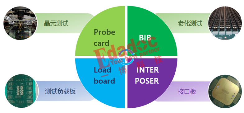 Load board 和BIB板为芯片封装后FT端的测试。封装后成品FT测试,常应⽤与功能测试、性能测试和可靠性测试中,检查芯⽚功能是否正常,以及封装过程中是否有缺陷产⽣,并且帮助在可靠性测试中用来检测经过“⽕雪雷电”之后的芯片是不是还能⼯作。